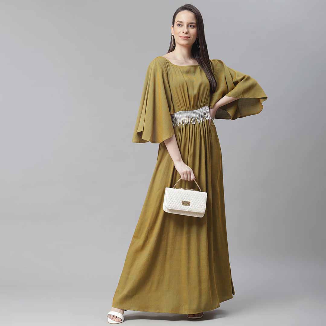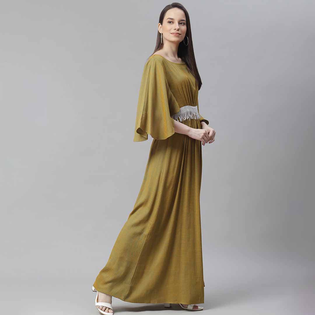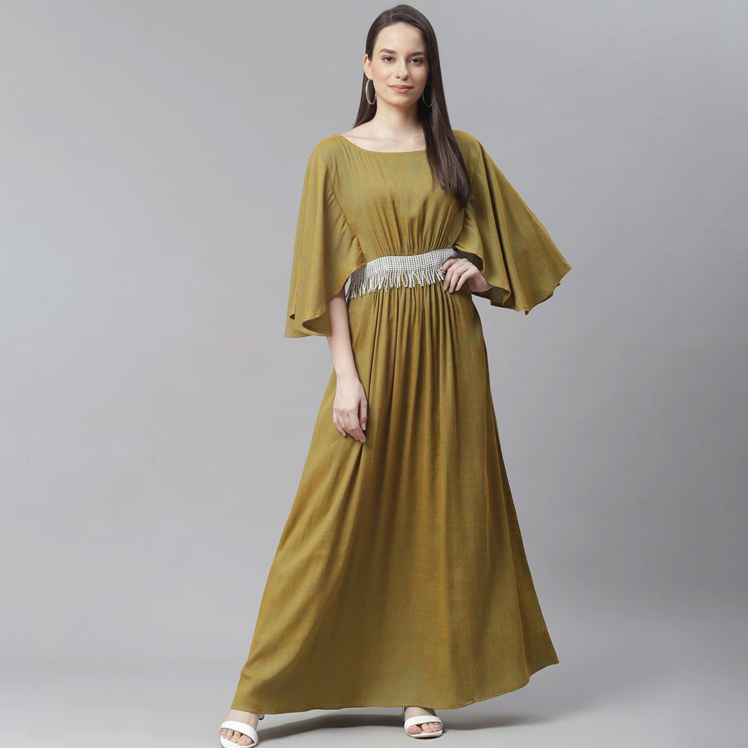 bell sleeved embellished maxi dress looking for some awesome collection of dresses? well, lay your hands on this dress from cottinfab and also get the option of choosing from yellow colour. dress up in a soothing pattern and don this dress made of rayon material. satiate your love for dresses by grabbing s size priced at ₹1389 .