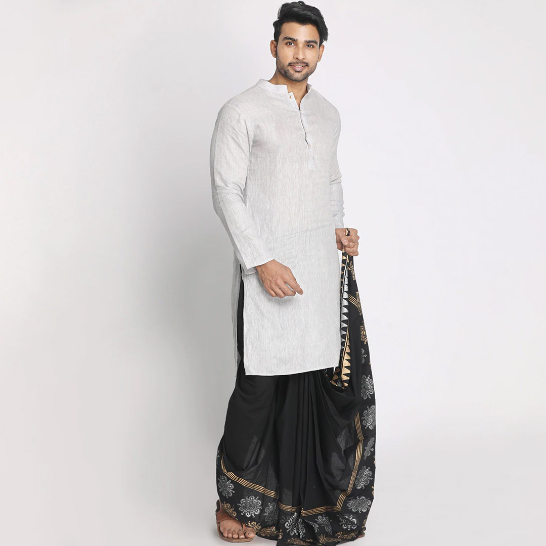 get traditionally stylish with this black pure cotton geometric pattern handblock print dhoti. featuring front and back pleats and drawstring details. dhoti is the traditional attire for men across india. it is often misinterpreted with lungi or loongi, but is a different attire.