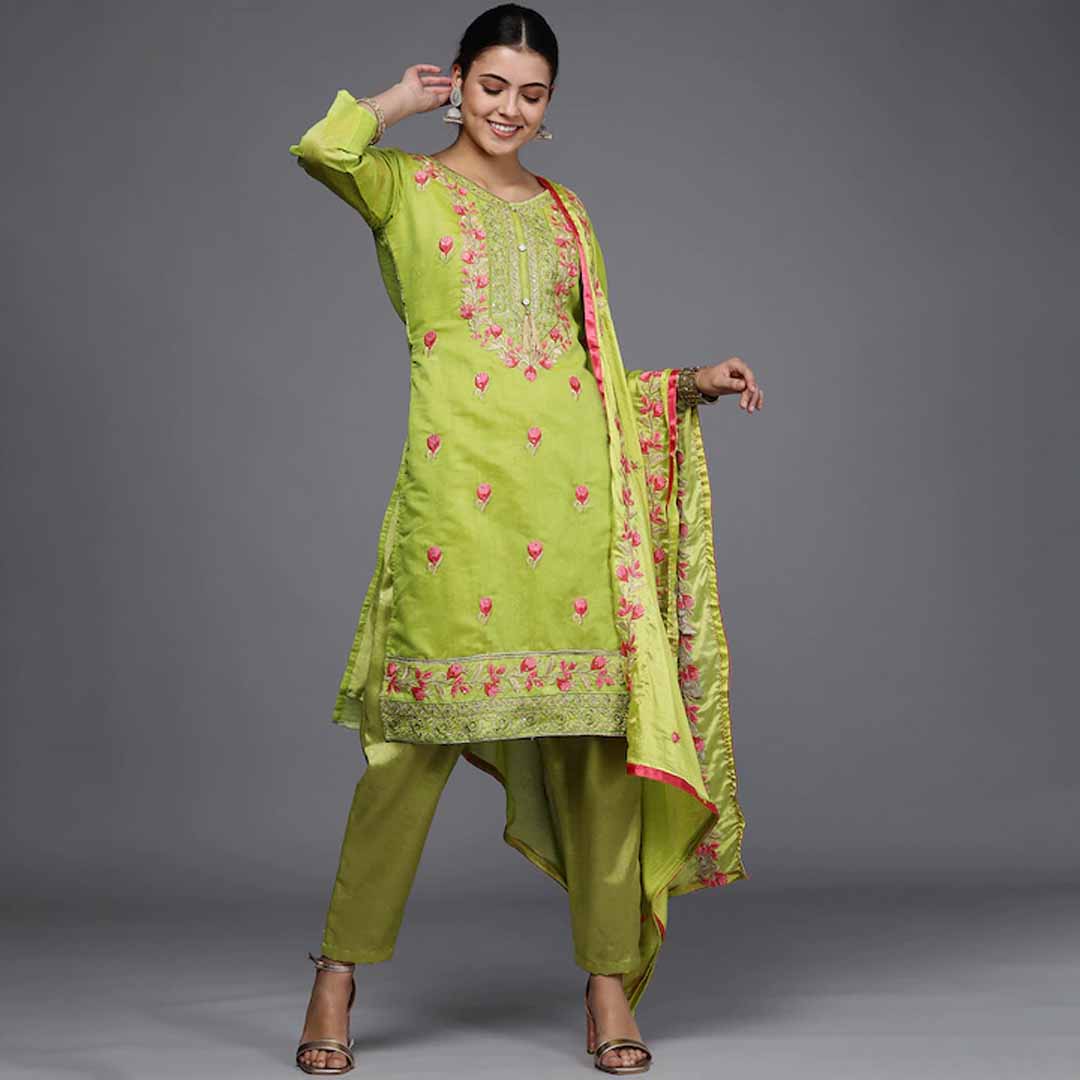 Green embroidered unstitched dress material
