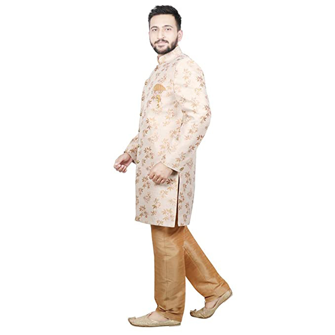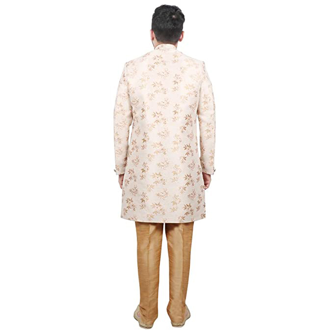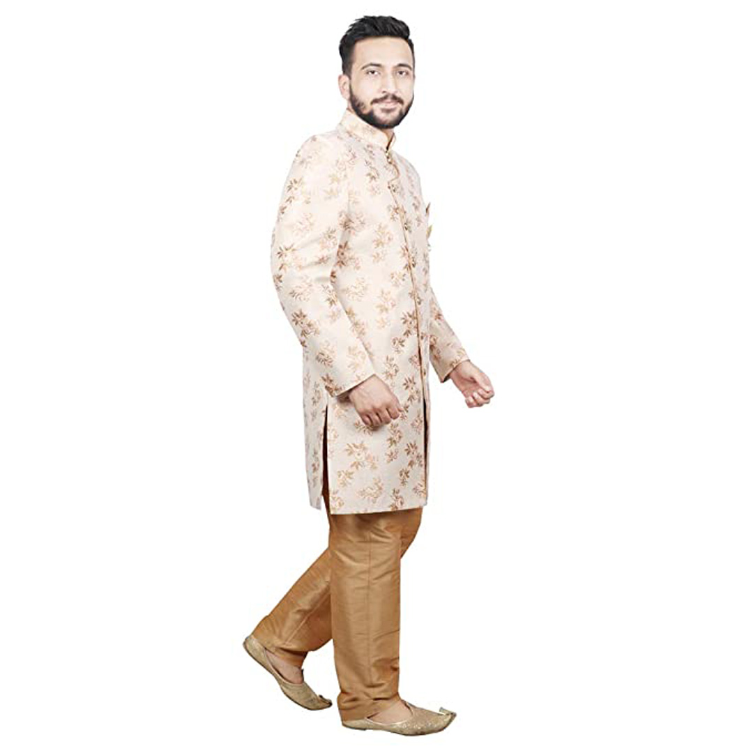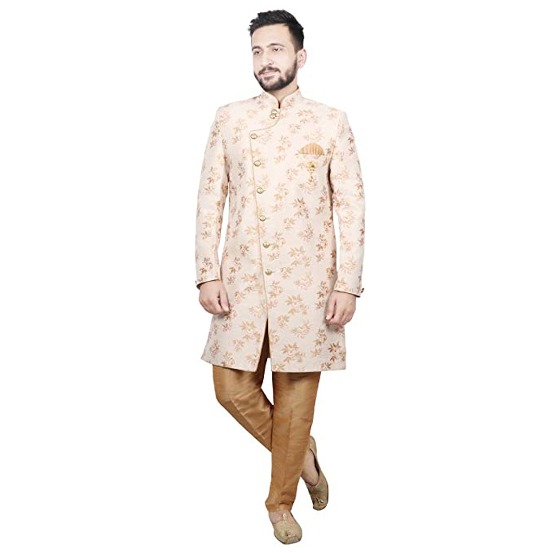 Aggrandize your prince's personality by dressing him in traditional Sherwani. Made from Good fabric. This cloths set comes with Sherwani , Mandrian collar. This product is available in Various colors . The fit is regular for men clothing. The ethnic wear set will contribute to an absolute traditional look and will make your son look adorable.We are leading Brand in Men wear with wide range of mens clothing which includes Men ethnic wear and a lot more.
