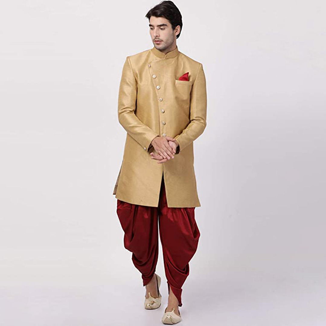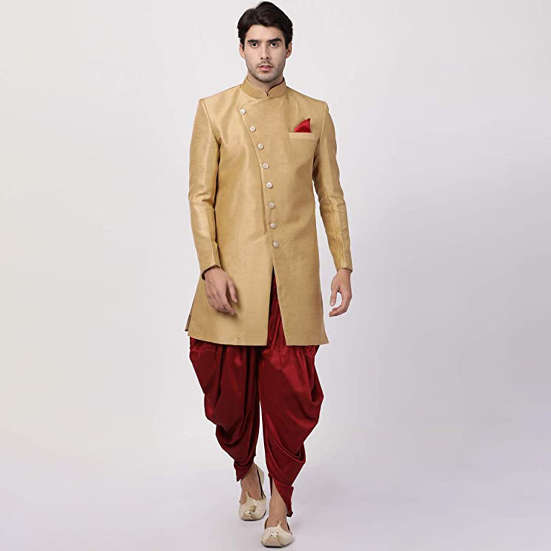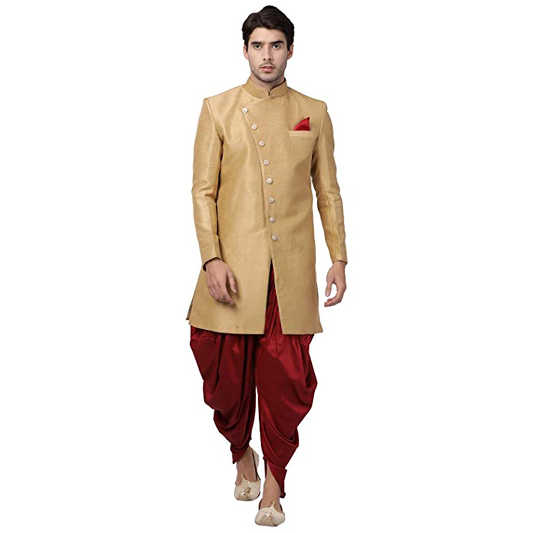 Product Details: We introduces to you these classy sherwani for men stylish latest design in variety of material and designs for all occassions. This fabric has been designed keeping in mind the latest trends in a semi formal fashion or occassional fashion. Engineering garments which fit all body types and style is our aim. We offer not just servani for man for wedding but also indo western for men and semi sherwani as well covering the entire space. Our servani are constructed in such a way that you can adorn it with a churidar, dhoti for men or a patiala too. To complete the look adorn a mojari or jutti slippers for men stylish, you may also try an authentic Kohlapuri chappal for men, the fashionistas and millennial folks may experiment with a brogues or oxfords juta for men stylish. Suitable for: Party, Weddings, Regular Wear, Celebrations, Occasions, Festivals, Lohri, Pongal, Makar Sakranti, Baisakhi, Holi, Eid, Raksha Bandhan, Dussehra, Diwali, Navratri, Pooja, Christmas, Onam, Ganesh Chaturthi, Janmasthmi and Gifts for Mens. SIZE:The above mentioned model is wearing the size of "L" WASH AND CARE: Dry Clean Only FIT TYPE: Regular Fit