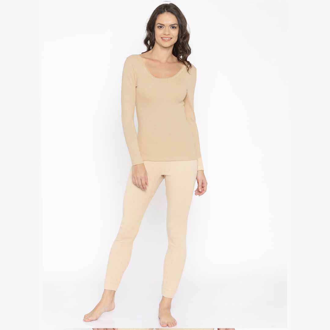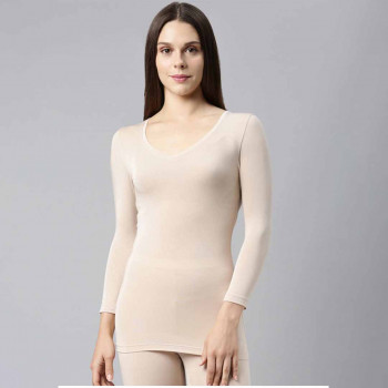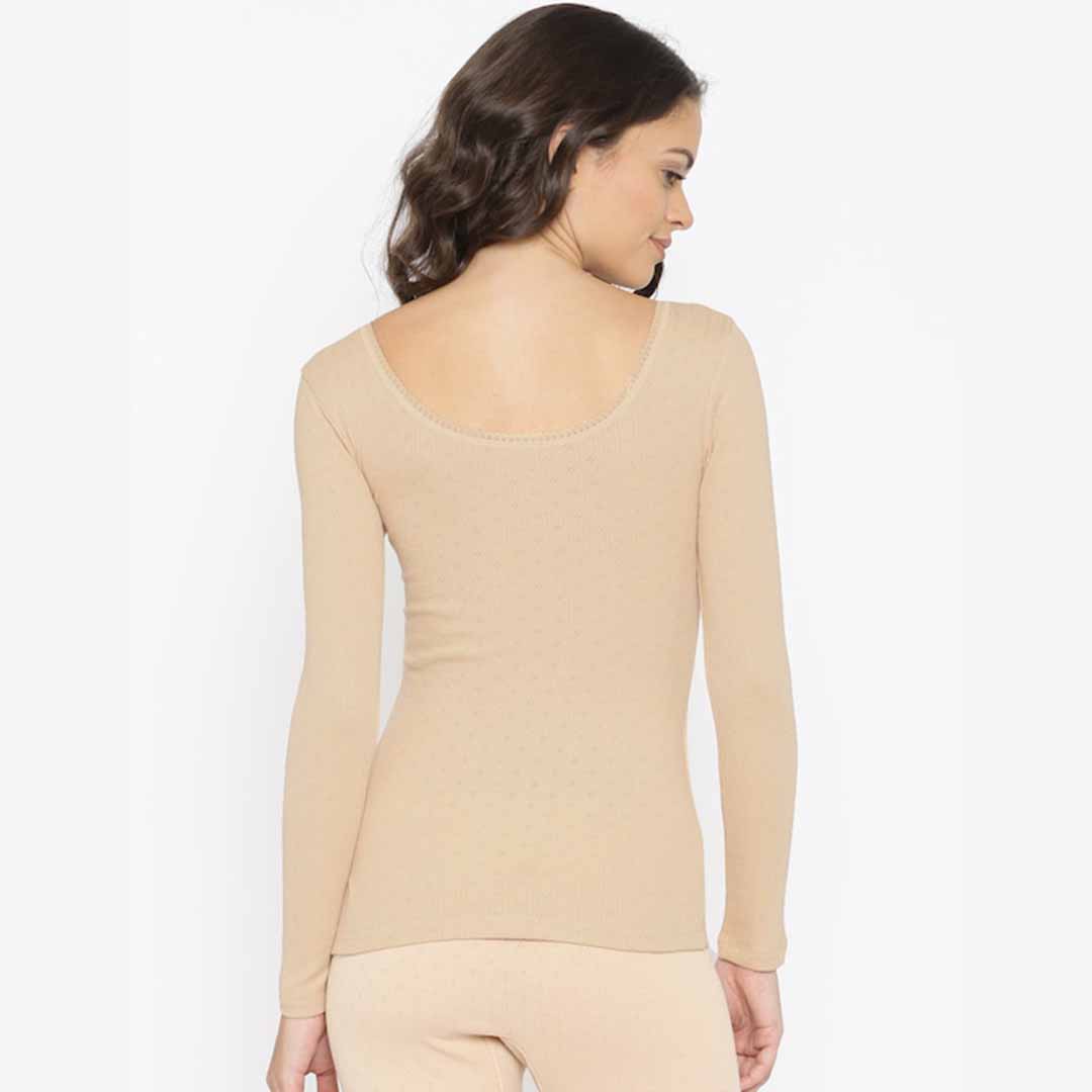 Nude-coloured knitted thermal top in a patterned weave, has a round neck, long sleeves