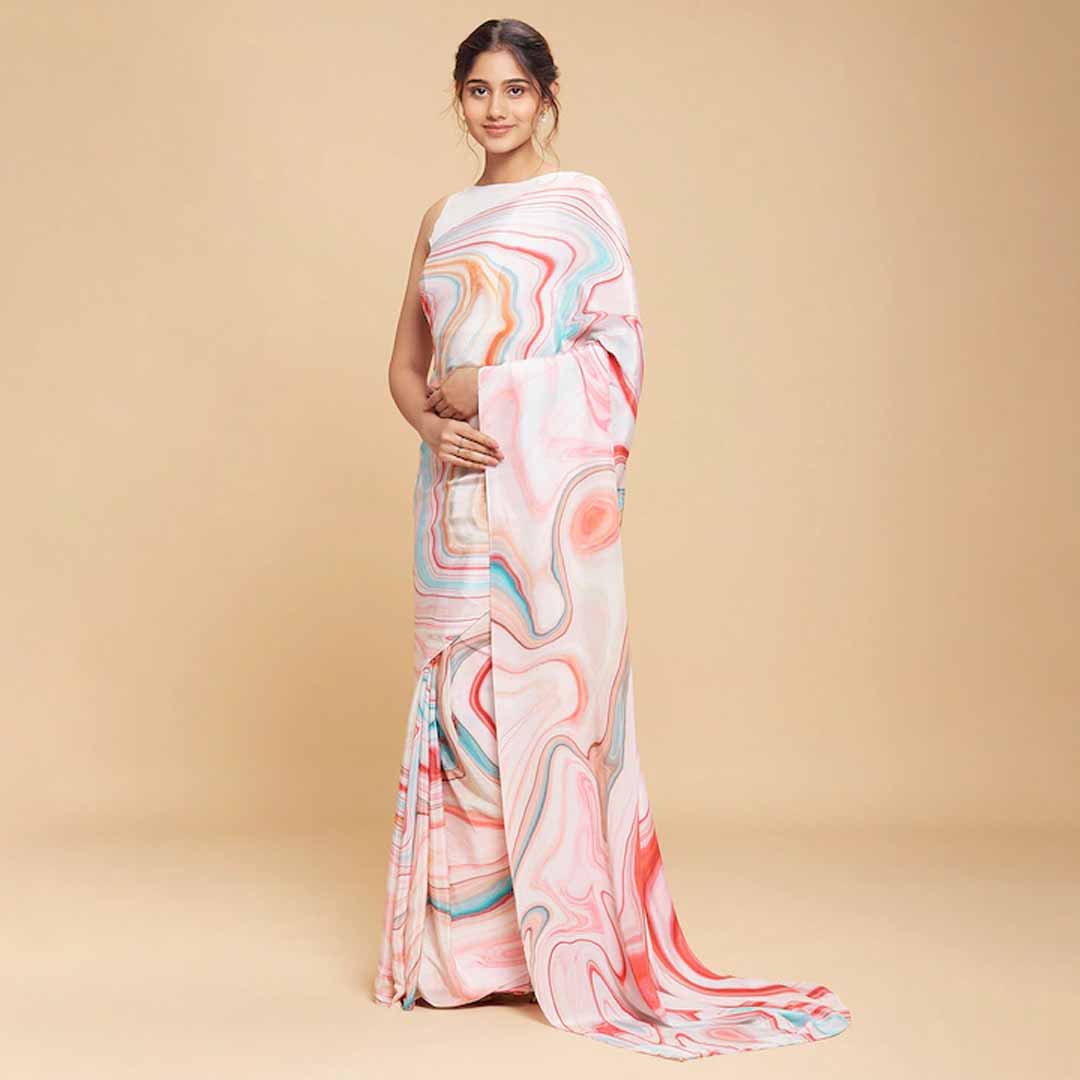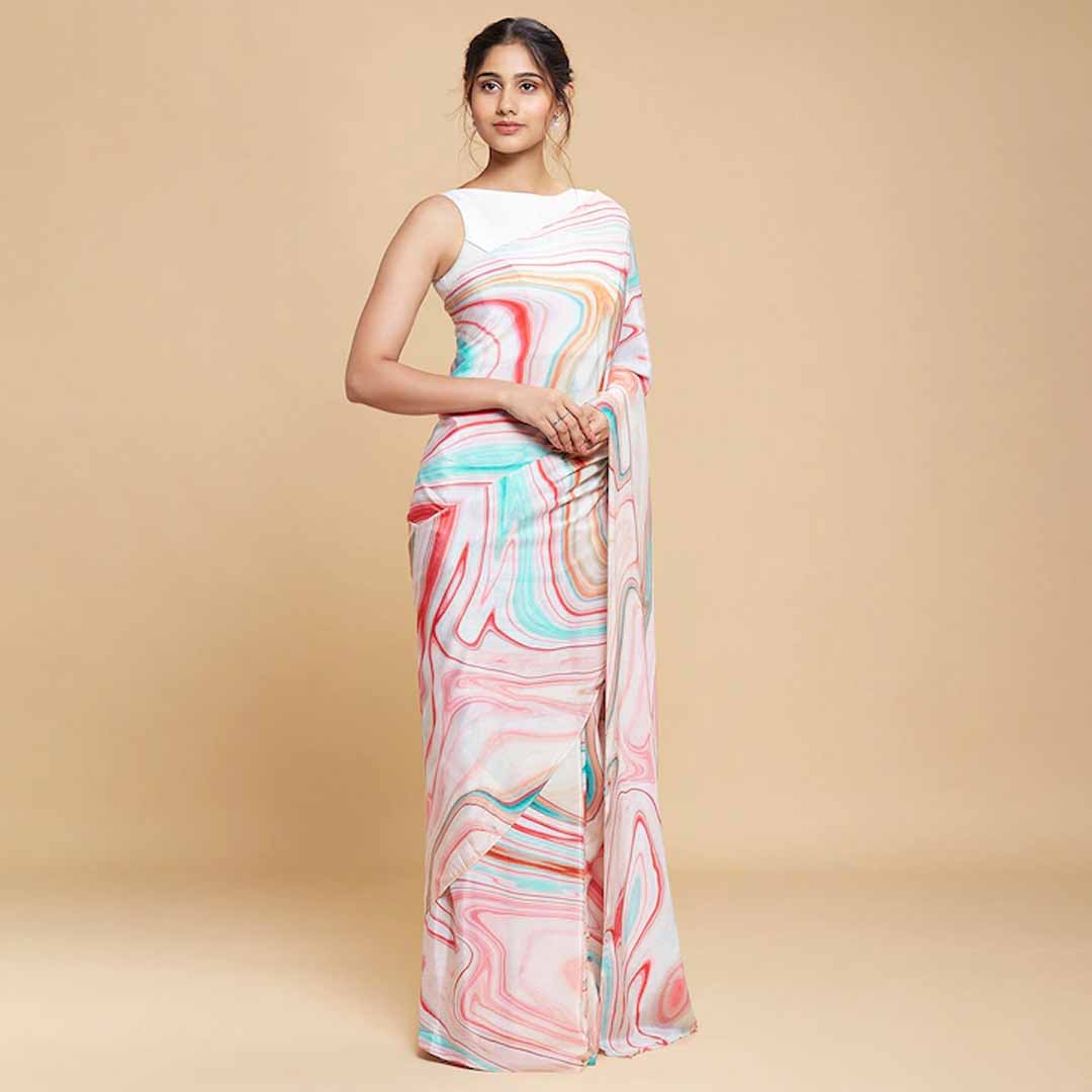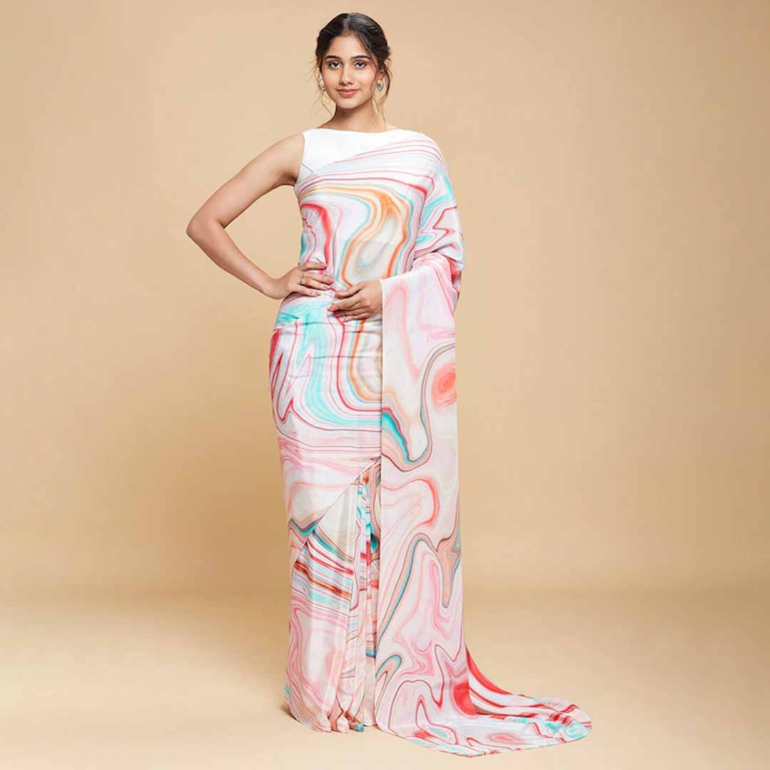 Pink and red saree Abstract printed saree with no border