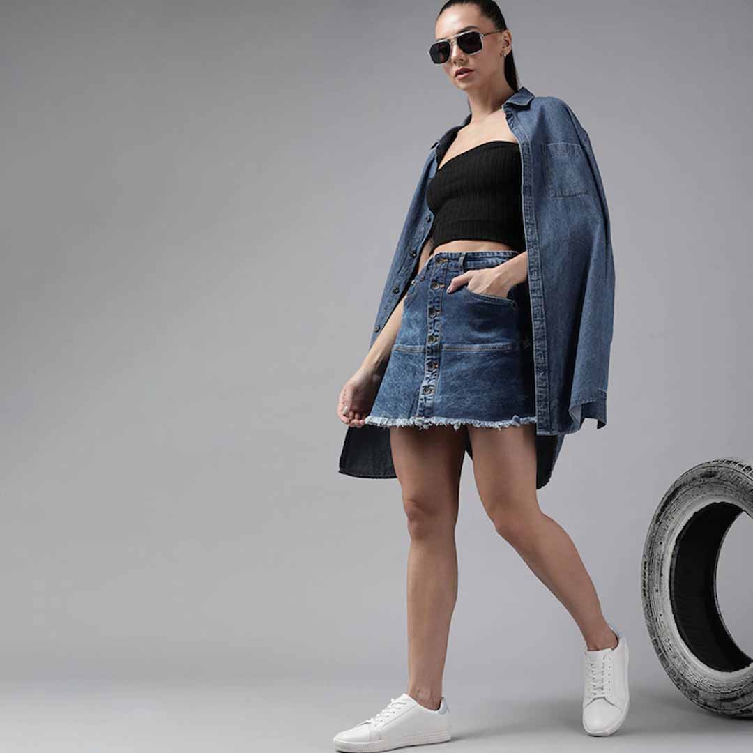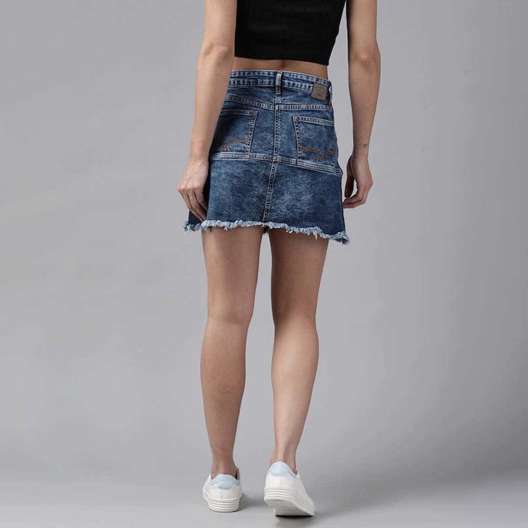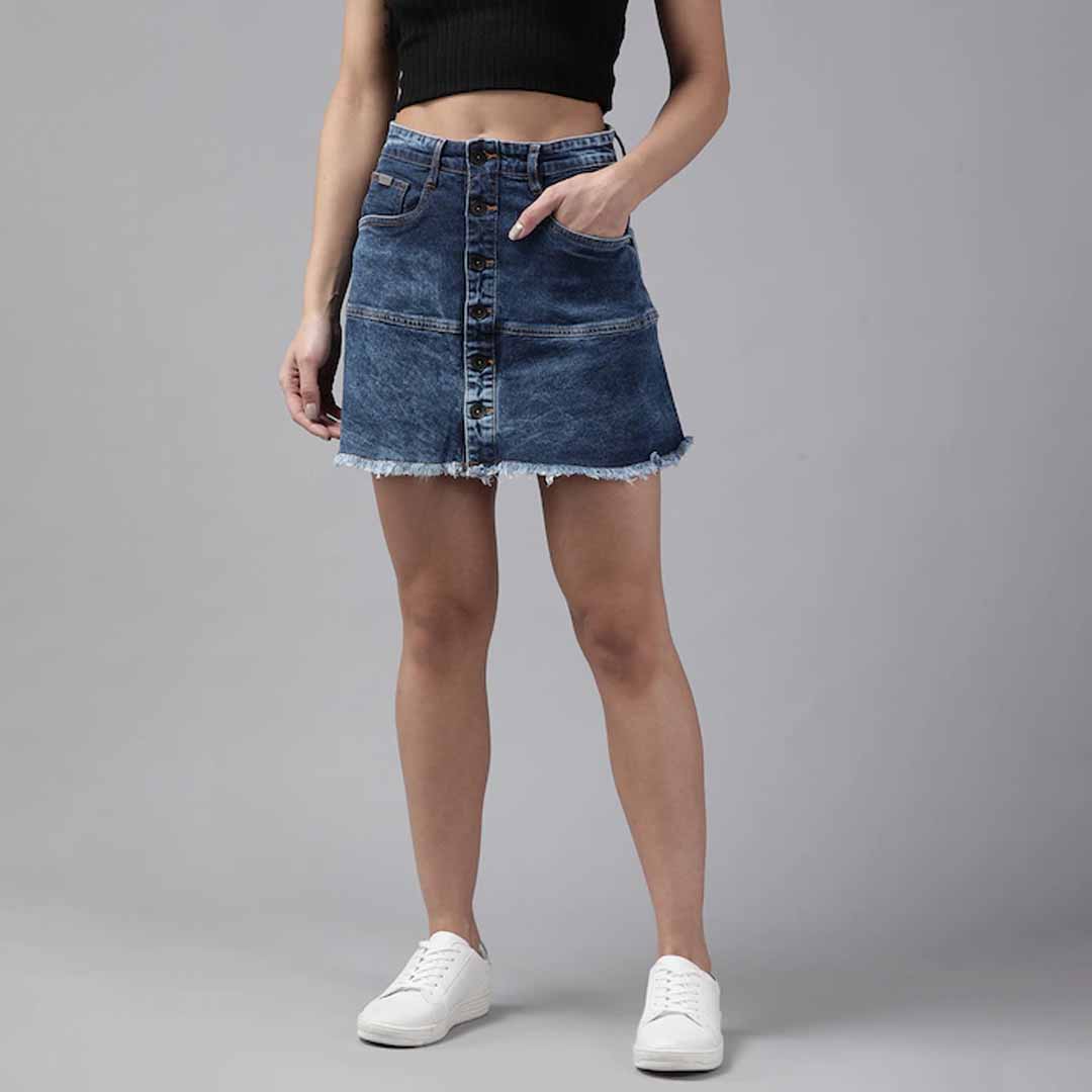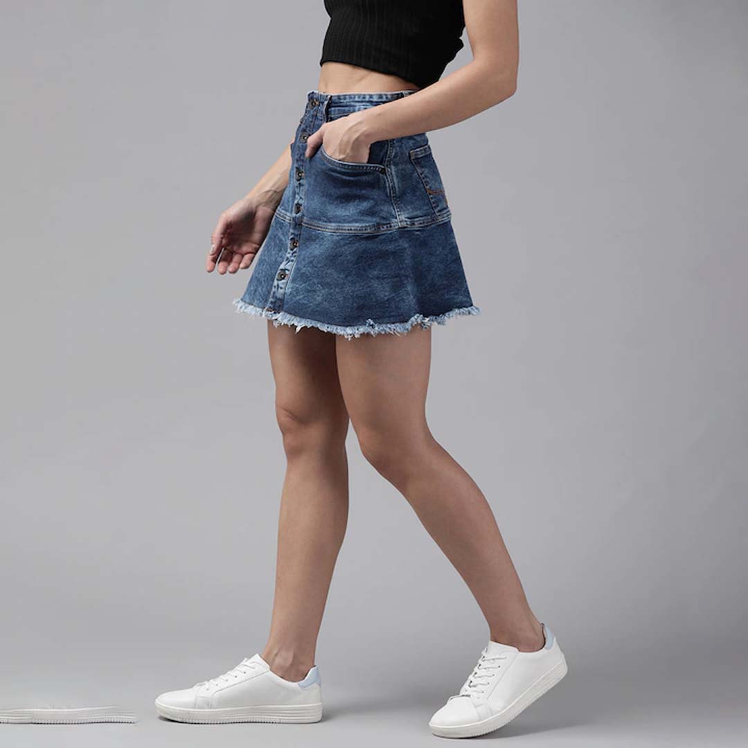 Blue washed woven denim A-line skirt, has waistband with belt loops, button placket, 5 pockets, and fringed hem