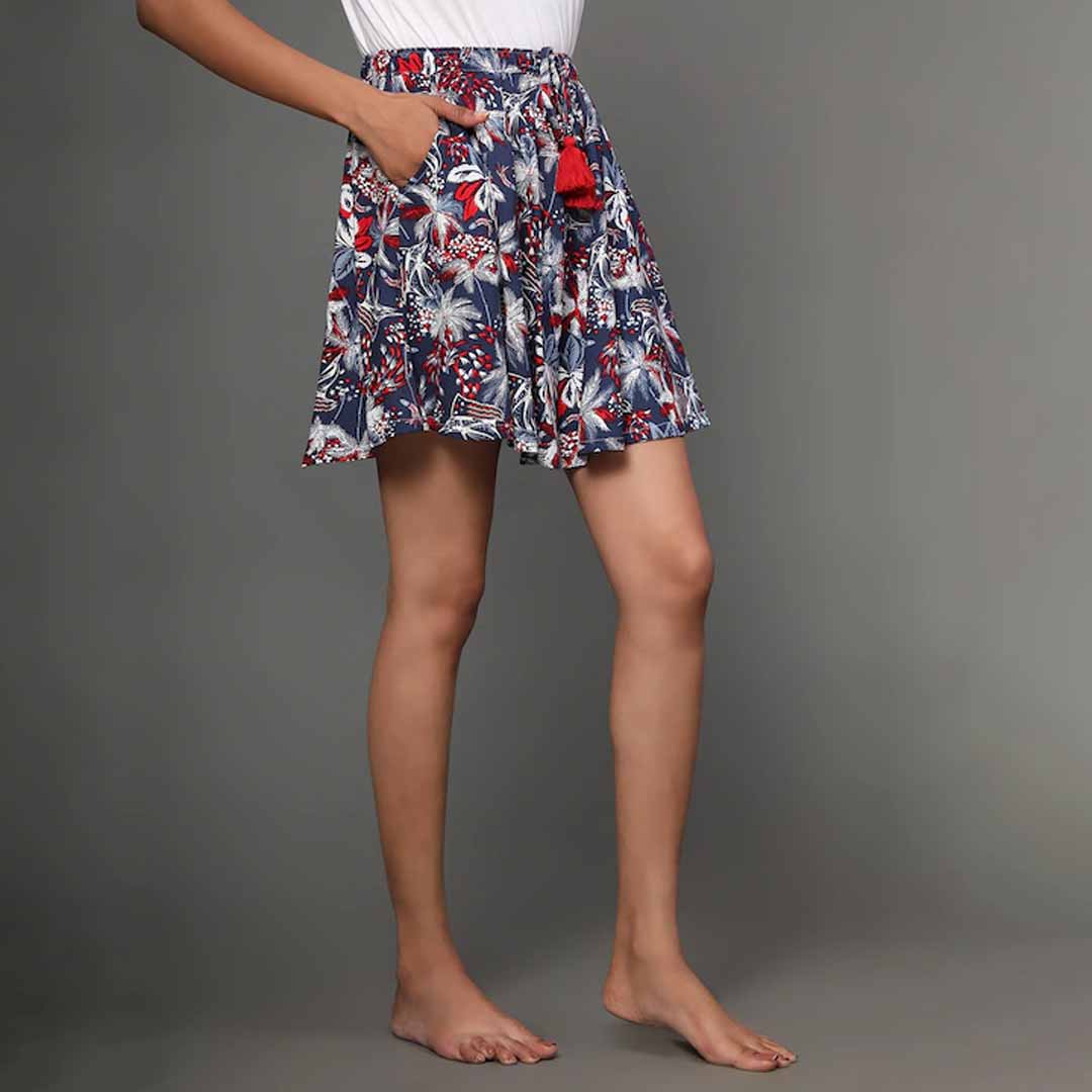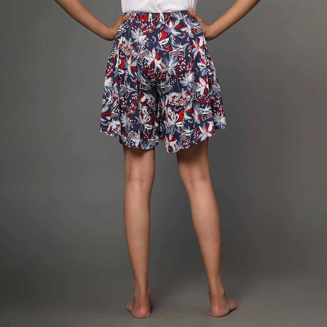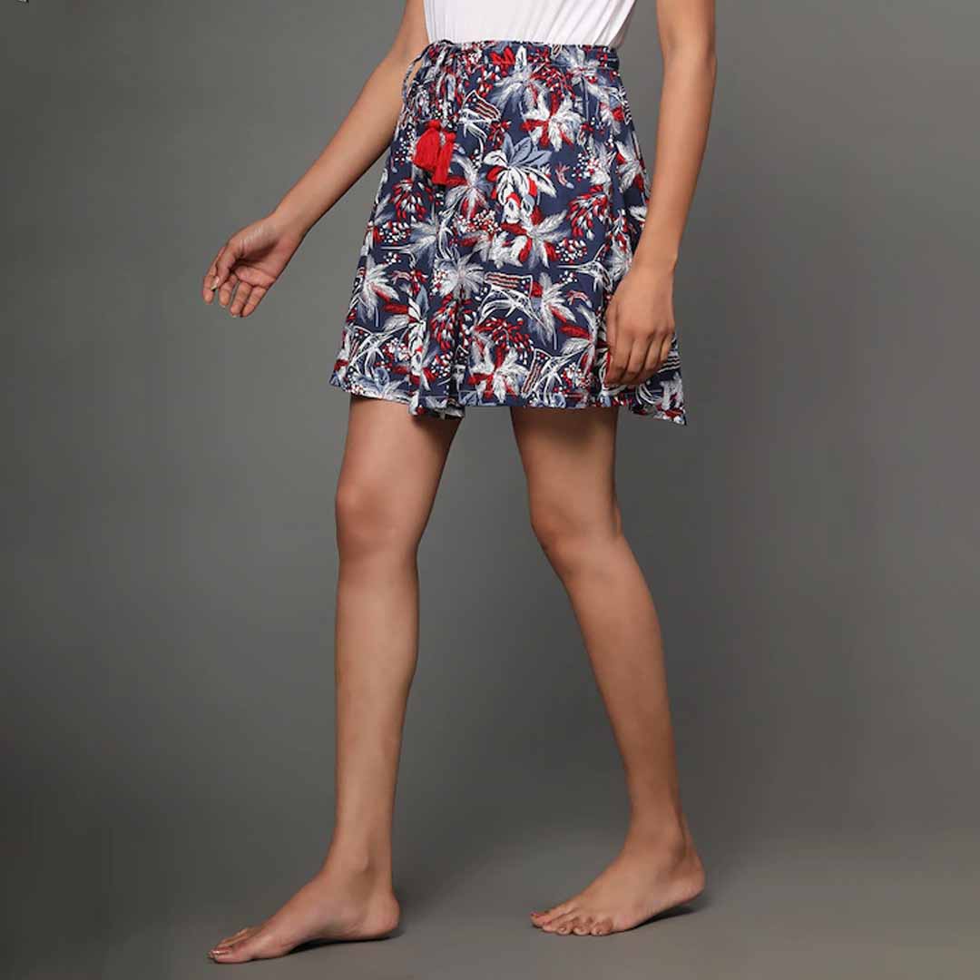 Navy blue mid-rise printed woven lounge shorts, has inner elastic waistband with drawstring closure, 2 pockets