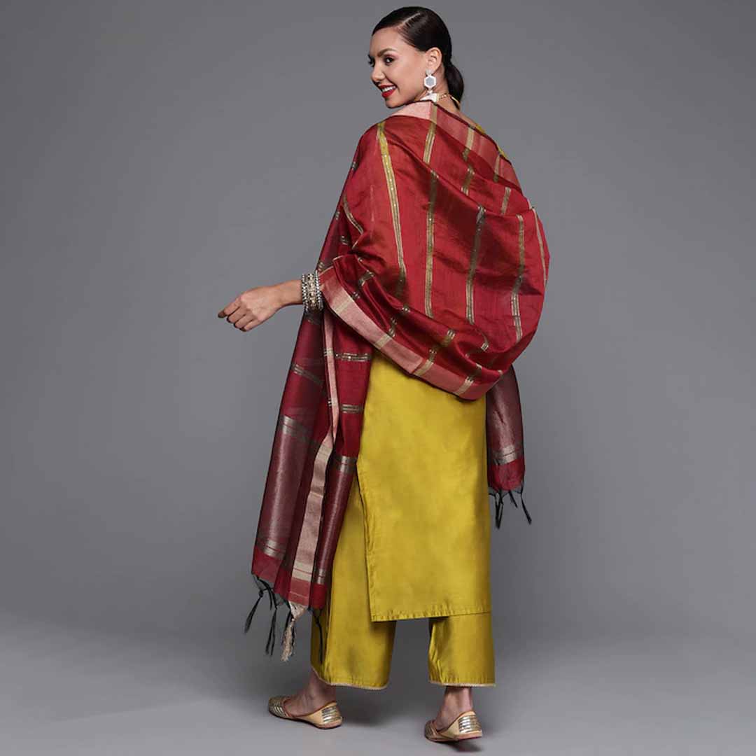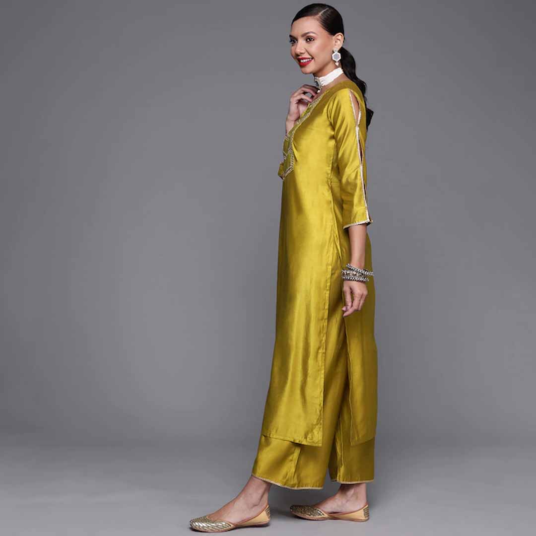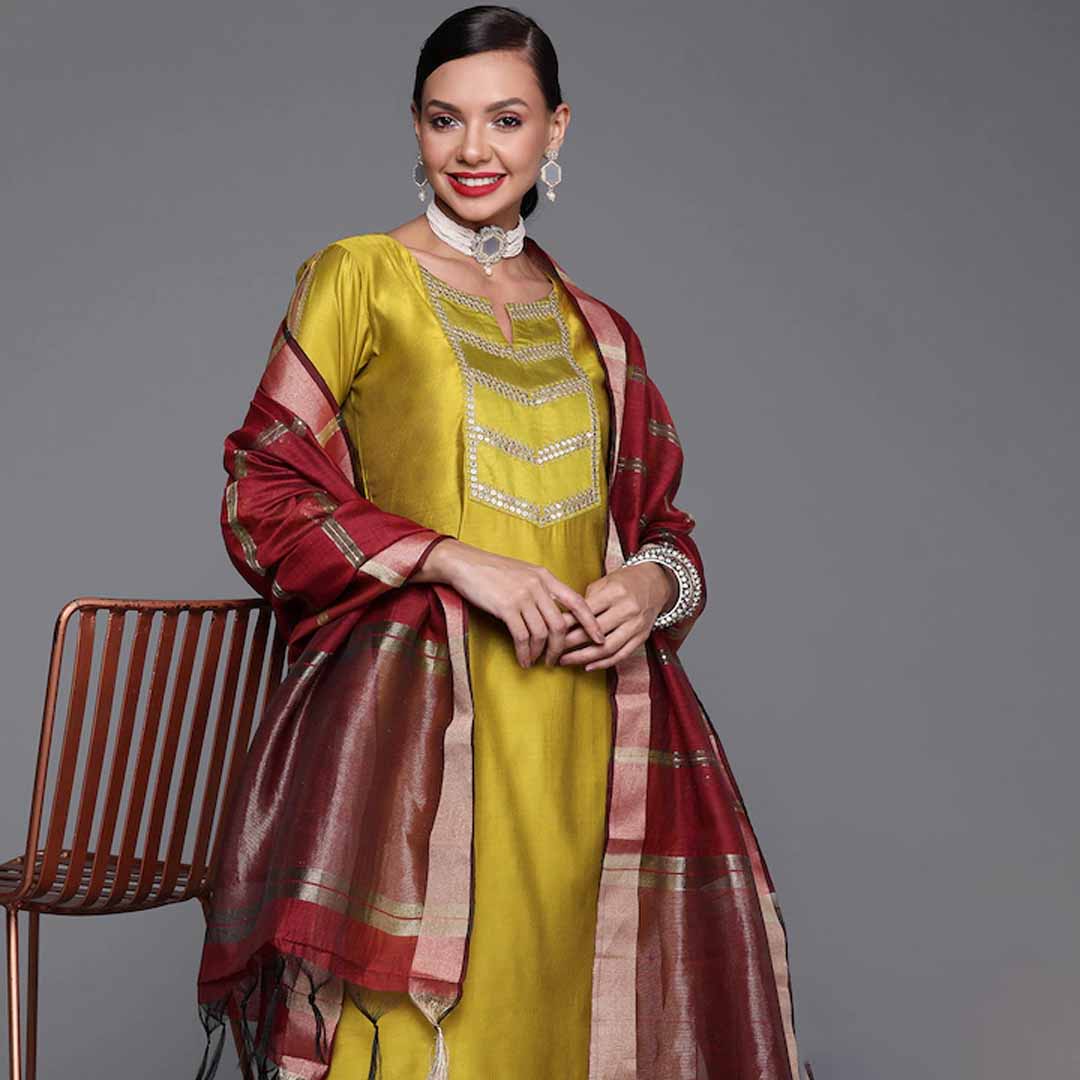 Olive green embroidered Kurta with Trousers with dupatta Kurta design: Ethnic motifs embroidered Straight shape Regular style Round neck, three-quarter regular sleeves 2 pockets Sequinned detail Calf length with straight hem Liva machine weave fabric Trousers design: Solid Trousers Partially elasticated waistband Slip-on closure With printed dupatta, tassel border