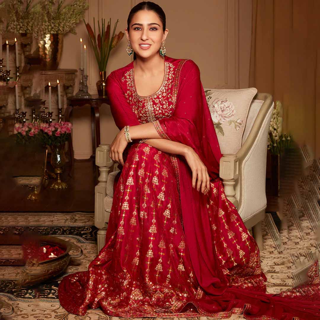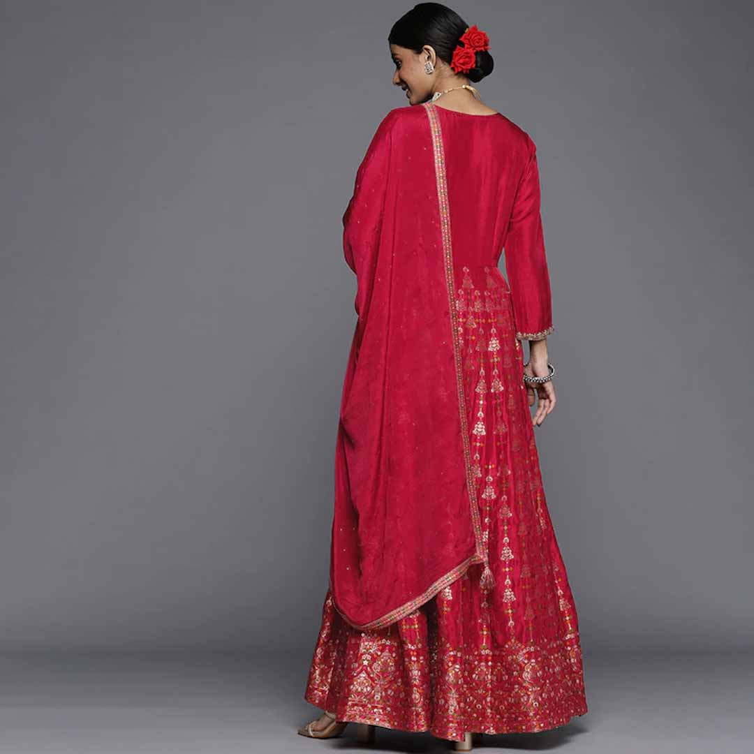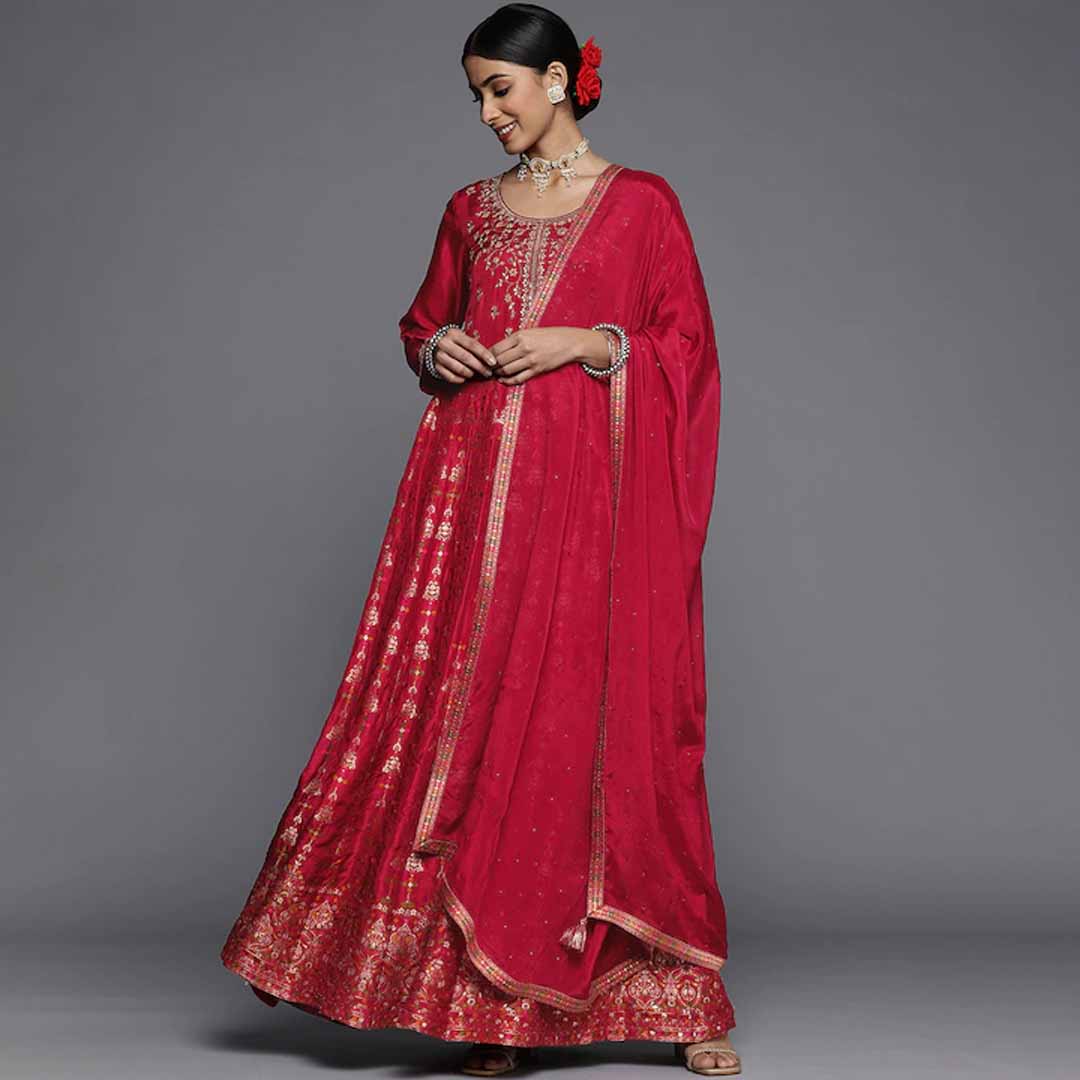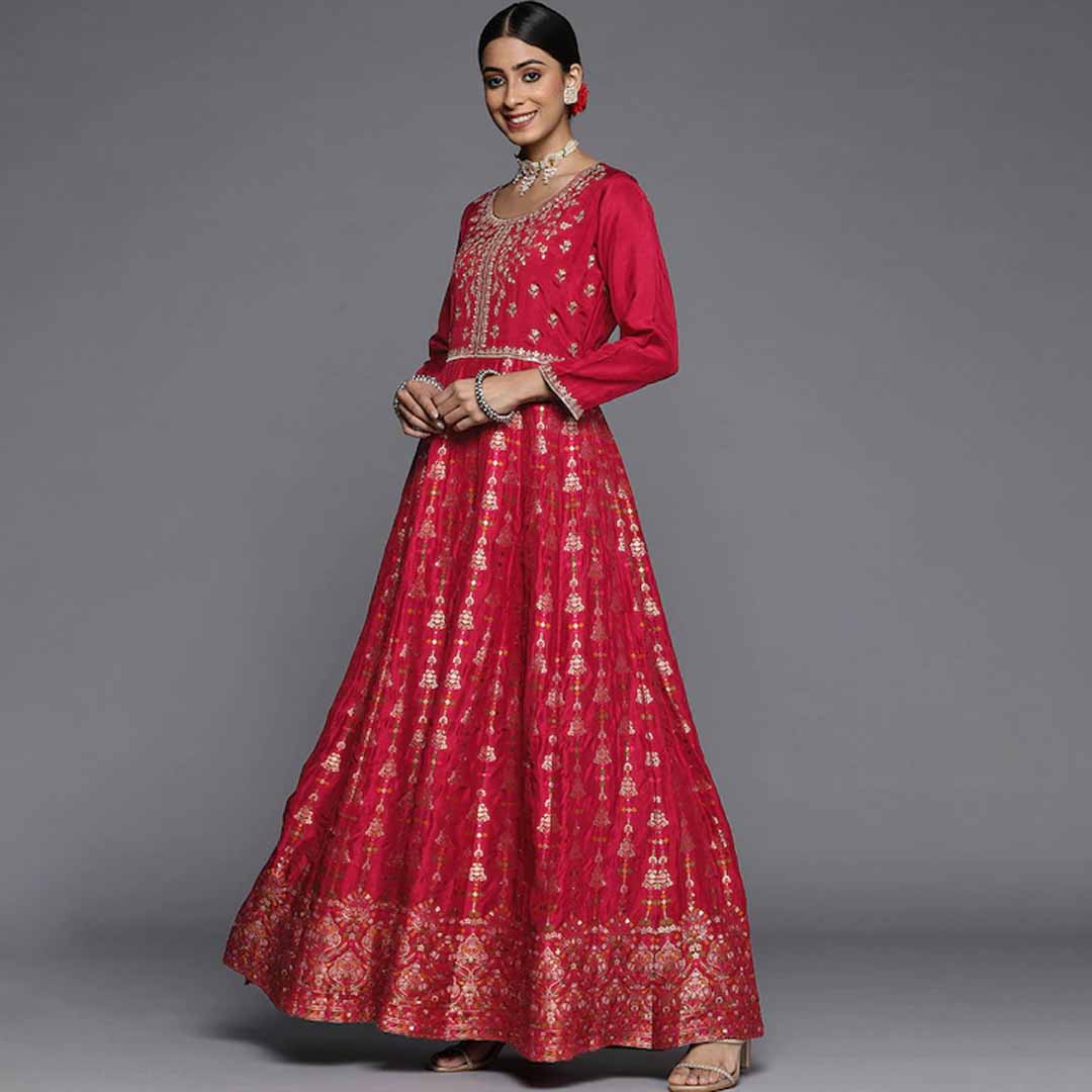 Red embroidered Kurta with Churidar & dupatta Kurta design: Floral motifs embroidered Anarkali shape Panelled style Round neck, three-quarter regular sleeves Sequinned detail Floor length with flared hem Silk blend machine weave fabric Churidar design: Solid Churidar Elasticated waistband Slip-on closure Comes with a dupatta