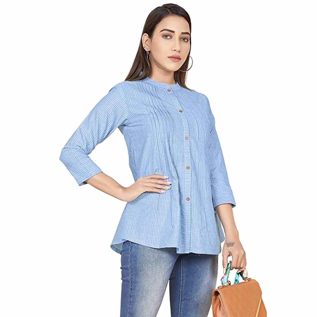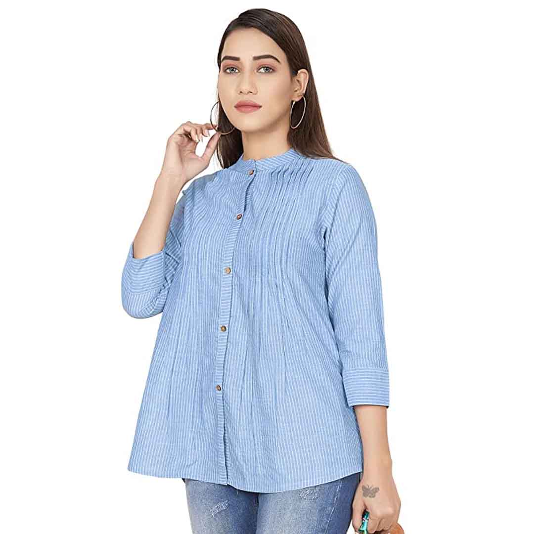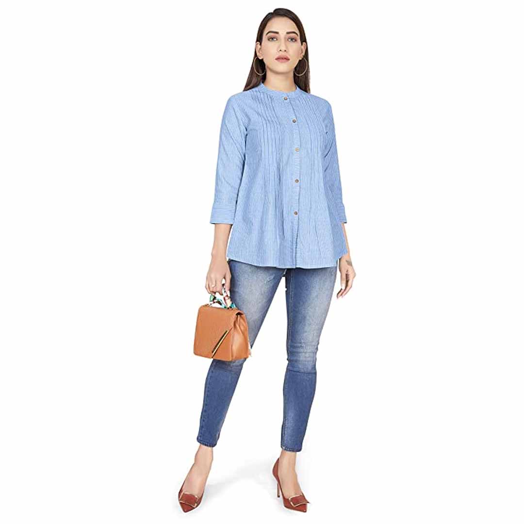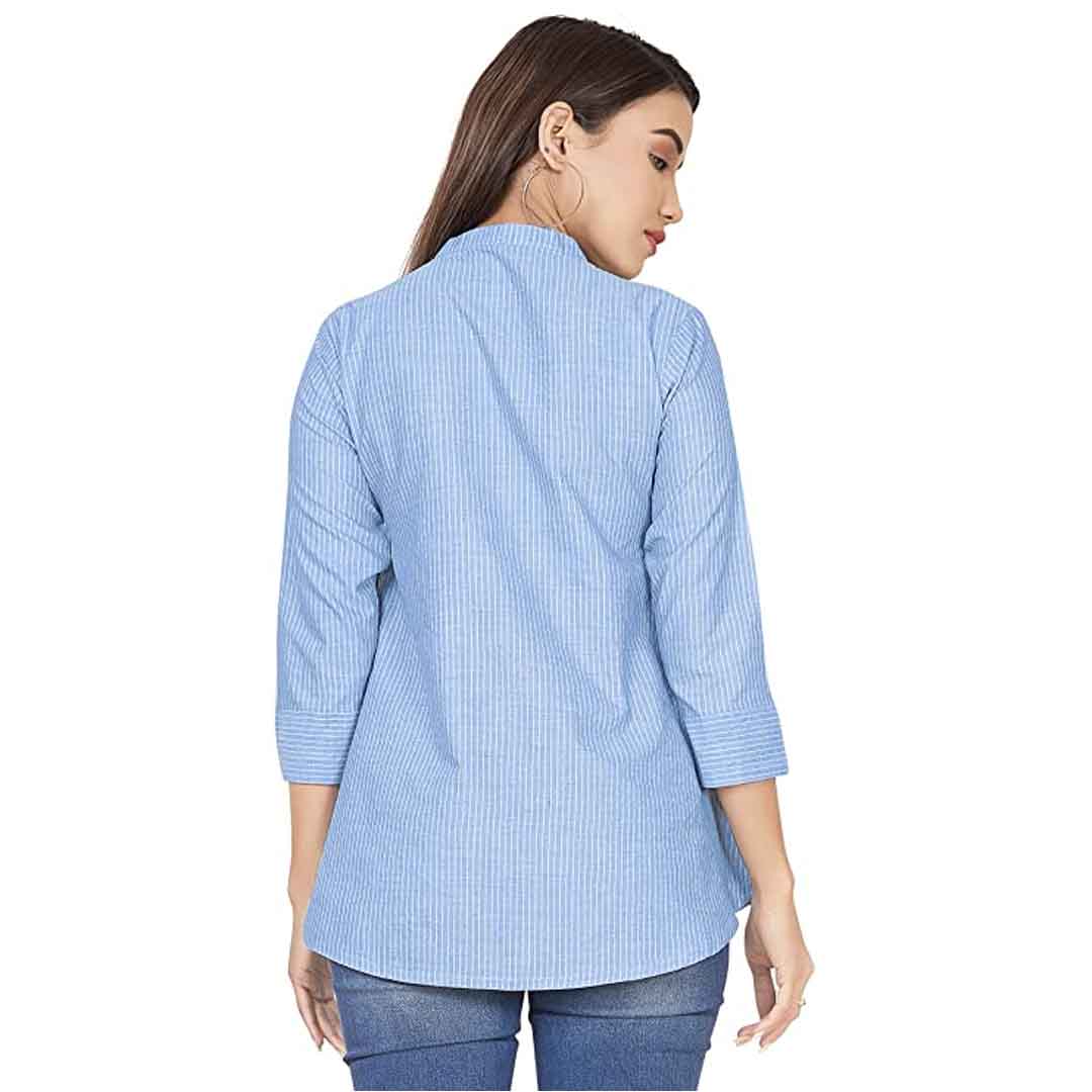 Spruce up your wardrobe with this stripe printed top from available. This shirt style top is perfect for a day out with friends or a nigh get-togethers with family. Made guys adore your sartorial elegance, when you wear this orange colored casual stripe printed top. Made of cotton fabric, this regular fit top is extremely comfortable to wear. Featuring a mandarine collar neck, gathered detailing and 3/4 sleeves, front button closure, this top boasts of exclusive appeal. The top partially opens from the front for ease of wearing. Create a sophisticated style by teaming this top with a pair of jeans and strappy sandals.